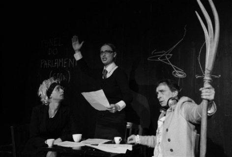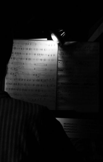 Veverky, jak studuje repliku slavného historického notového partu, který napsal sir Jethro Tull,